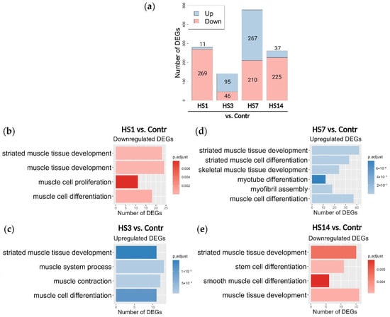 Differentially expressed genes associated with muscle regeneration and differentiation processes: (a) Number of up- and downregulated differentially expressed genes (DEGs) found in all four pairs (HS vs. Control); log2 fold change > 1.5, p < 0.01; (b–e) GO Enrichment Analysis of upregulated and downregulated DEGs using GO Biological Process database.