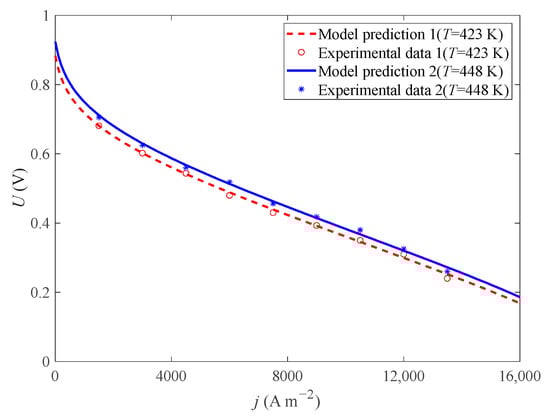 According to the test conditions in reference [] and the model parameters in Table 1, this paper compares the experimental voltage and model voltage under different operating temperatures (T = 423 K and T = 448 K) (p = 1 atm, DL = 5.6, RH = 0.38%). As shown in Figure 2, the result shows that the model voltage is basically consistent with the experimental voltage.