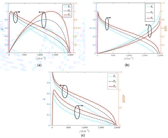 Different indexes vary with current density at different operating temperatures: (a) P and η; (b) δ and EPC; (c) φ and ECOP.
