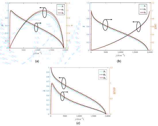 Different indexes vary with current density at different operating pressures: (a) P and η; (b) δ and EPC; (c) φ and ECOP.