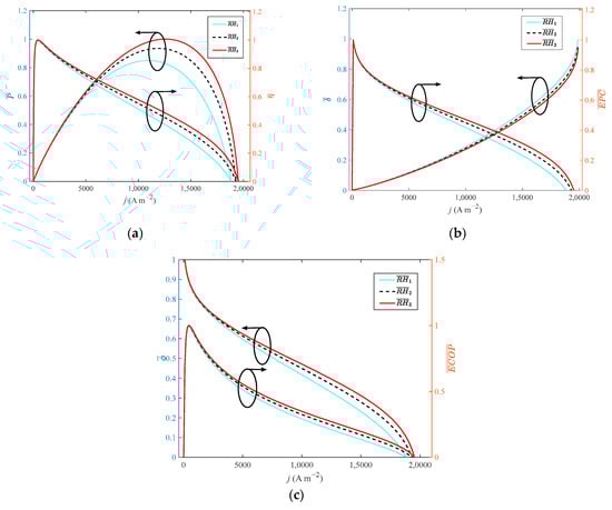 Different indexes vary with current density at different relative humidity: (a) P and η; (b) δ and EPC; (c) φ and ECOP.