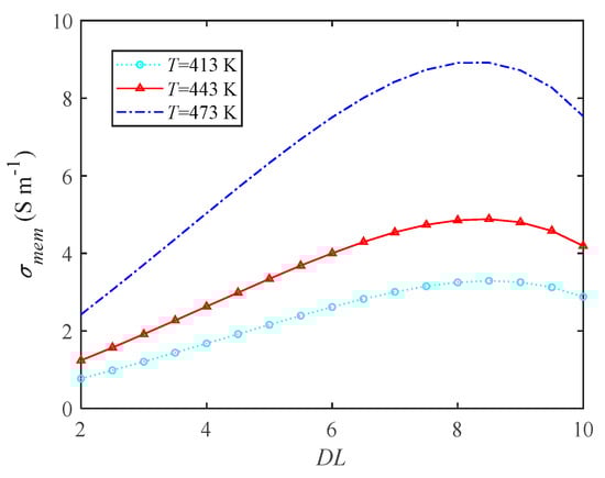 The high-temperature membrane of HT-PEMFC is a PBI membrane. The doping level (DL) of a PBI membrane refers to the ratio of the mass difference between after acidification and before acidification to the mass before acidification. The proton conductivity is a function of the doping level, and the specific relationship is shown in Figure 6. With the increase in phosphoric acid doping level, the proton conductivity first increases and then decreases. When the is 8, the proton conductivity reaches the maximum value, and the ohmic overpotential is the smallest at this time. Moreover, increasing the operating temperature of HT-PEMFC can significantly improve the proton conductivity, therefore the operating temperature has a great influence on the performance.