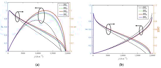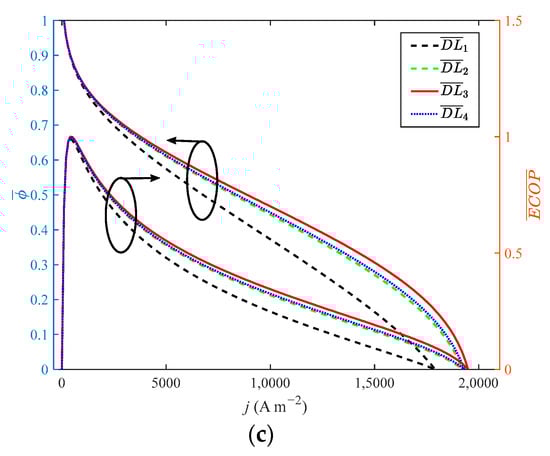 As shown in Figure 7, when the doping level increases from 4 to 10 with a step width of 2, the growth rate of the doping level is 150%. When reaches 8, the performance of HT-PEMFC is optimal. When the growth rate of the doping level is 100%, the dimensionless of P, η, EPC, φ and ECOP only grow by 31.1%, 0.4%, 0.09%, 1.1% and 1%, respectively. The dimensionless of reduces by 11%. Compared with Figure 4 and Figure 5, the growth rate of power density is more obvious. Guo et al. [] found that a higher doping level is beneficial to the performance of HT-PEMFCs. However, if the doping level is too high, phosphoric acid will be easier to leave out of the membrane. Therefore, 8 is considered to be the optimal value for DL.