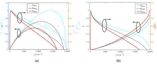 According to the experimental study, Santerelli et al. [] found that the leakage current density of LT-PEMFC increased with the rise of the operating temperature. When the operating temperature was 50–80 °C, the leakage current density reached 60–120 A/m2. Guo et al. [] took the leakage current density as a constant value of 50 A/m2 when studying the performance of HT-PEMFC. Shaker [] obtained the leakage current density when PEMFC operated at a certain temperature through an experimental study. Based on previous studies on the leakage current density of HT-PEMFC, the leakage current density model adopted in this paper is shown as follows []: