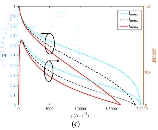 Different indexes vary with current density at different membrane thicknesses: (a) P and η; (b) δ and EPC; (c) φ and ECOP.