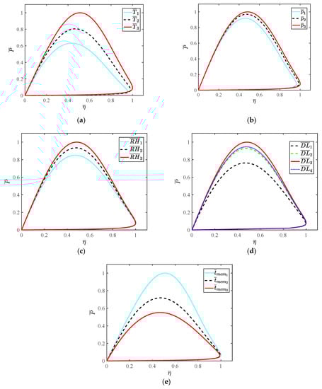 In order to better compare the impact of different parameters on the performance index of HT-PEMFC, the dimensionless method is also adopted in different parameters, including operating temperature (T = 413 K, 443 K, 473 K), operating pressure (p = 1 atm, 2 atm, 3 atm), relative humidity (RH = 0, 3.8%, 7.6%), the phosphoric acid doping level (DL = 4, 6, 8, 10) and membrane thickness (= 0.002 cm, 0.006 cm, 0.010 cm). The phosphoric doping level, depending on the phosphoric acid concentration, doping temperature and soaking time, is defined as the number of phosphoric acid molecules per polybenzimidazole []. The dimensionless expression of operating temperature is as follows:
