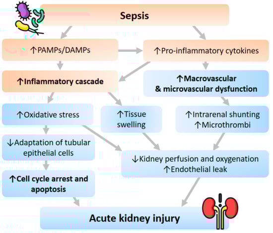 In the state of sepsis, inflammatory mediatory molecules such as pathogen-associated molecular patterns (PAMPs) and damage-associated molecular patterns (DAMPs) are released into the intravascular space and bind to receptors such as Toll-like receptors (TLRs) on the surface of immune cells. This reaction subsequently initiates a sequence of the signal cascade, producing and releasing pro-inflammatory cytokines. Besides, renal tubular epithelial cells also have expressed TLRs, especially TLR-2 and TLR-4. Thus, a similar pathway will be activated once PAMPs or DAMPs are filtered through the glomerulus, leading to increased oxidative stress, production of reactive oxygen species, and mitochondrial injury [,,].