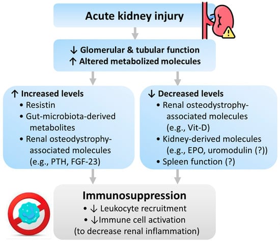 Erythropoietin (EPO) and uromodulin are kidney-derived molecules that influence macrophage and sepsis progression. Experiments have shown that EPO level increases within the first 48 h of AKI and then drops progressively []. EPO benefits immunomodulation by normalizing activated CD4(+) T lymphocytes and their proliferative capacity, hastening efferocytosis, and suppressing inflammatory gene expression [,]. Therefore, decreased EPO levels in AKI might be associated with immunosuppression.