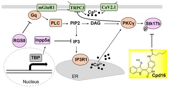 The recently reported molecules RGS8, Inpp5a and Stk17b are involved in the mGluR1-PKCγ signaling pathway in the cerebellum. A new drug, Cpd16 has been shown to work as inhibitor to Stk17b, which can regulate the downstream mGluR1 signaling pathway.