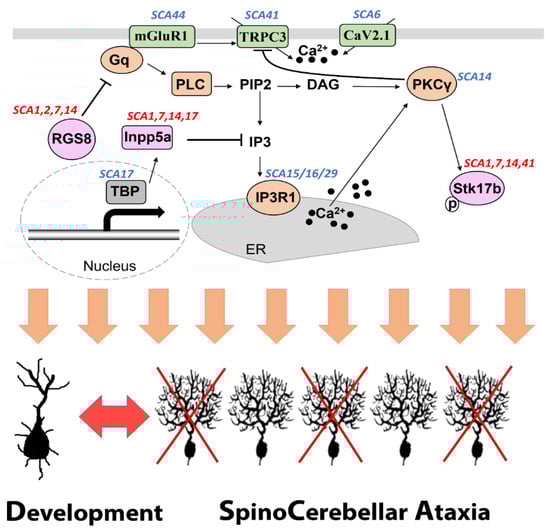 Some studies have focused on the analysis of the gene expression on the global transcriptional level by the use of animal or cellular models and aimed to identify genes with an altered expression in SCAs [12,13,14]. In this review article, we will specifically focus on the molecules linking Purkinje cell development to SCAs and elaborate the function of these molecules that are causing SCA and at the same time play a role in the development of Purkinje cells. Furthermore, we will review recently identified key molecules dysregulated in different SCAs and discuss how they participate in the emerging shared pathogenic pathways in the SCAs, in particular the mGluR1-PKCγ signaling pathway.