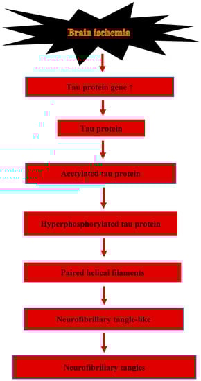 Increased accumulation of tau protein in neuronal cells, astrocytes and oligodendrocytes in the cortex, hippocampus and thalamus has been established in experimental studies [,,,,,] as well as in human brains after ischemia [,,]. Accumulating tau protein was also visible in the microglia in the focal brain ischemia penumbra [,,,]. Observations indicate that brain cells accumulate the tau protein as a result of ischemia [], which indicates a significant phase in the development of pathological ischemic processes in the brain tissue []. The next study found that the modified tau protein blocks the traffic of neurofilaments, organelles, amyloid protein precursor vesicles and rises oxidative stress in the neuronal body, axons and dendrites, leading to the accumulation of amyloid protein precursor in neurons []. To this must be added the increase in the level of total tau protein that was investigated by brain microdialysis after complete ischemia [].