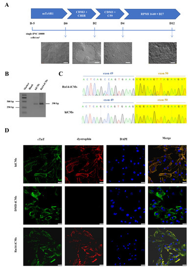 Expression of in situ corrected DMD in Rn14-iPSCs-derived cardiomyocytes (Rn14-iCMs). (A) Schematic diagram of the protocol for directional induction of iPSCs into cardiomyocytes and dynamic changes of cell morphology during differentiation of iPSCs into cardiomyocytes (iCMs). Scale bar: 200 μm. (B,C) RT-PCR analysis and Sanger sequencing with primers spanning DMD exon 50 of Rn14-iCMs and hiCMs were identical, with exon 50 existing at the cardiomyocyte stage. The green, red, blue and black font sequencing map represent the base A, T, C, G respectively. (D) Immunostaining for cardiomyocyte-specific markers cardiac troponin T (cTnT) (green) and dystrophin (red), and where the two markers merged were shown in yellow. DAPI was used to visualize the nucleus (blue). Scale bar: 25 µm.