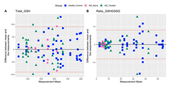 Bland–Altman plots for total GSH and GSH/GSSG comparing agreement between three repeat biomarker measurements for each individual. Upper and lower limits of agreement (dashed red lines) correspond to two standard deviations (SD) from the mean difference (solid black line).