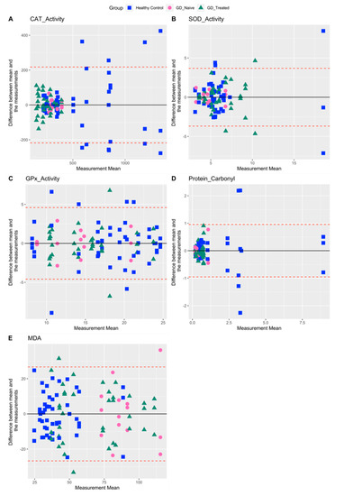 Among other measures of oxidative stress including CAT, SOD, GPx activity, protein carbonyl, and MDA, protein carbonyl showed the highest %CV for healthy controls and GD-naïve individuals (143.9 and 104.7, respectively) (Table 2). Protein carbonyl values in the GD-treated group were more tightly clustered around the lower end of the measured range (Figure 2D). Except for GPx activity, where observations from all three groups overlapped (Figure 2C), we found that measurements in healthy volunteers were more variable in terms of the range they spanned and intra-subject values. (Table 1 and Figure 2A,B,D,E). In contrast, patients with GD showed lower values and less variability (both inter- and intra-subject), especially for the antioxidant CAT (Figure 2A), whereas the lipid peroxidation measure MDA showed the opposite trend (Figure 2E).