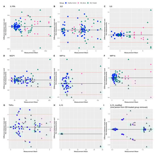 Bland–Altman plots for inflammation related biomarkers comparing agreement between three repeat biomarker measurements for each individual. Upper and lower limits of agreement (dashed red lines) correspond to two standard deviations (SD) from the mean difference (solid black line). IL-10_modified: Data for one participant from the GD-treated group was omitted because of apparent outlying measurements.