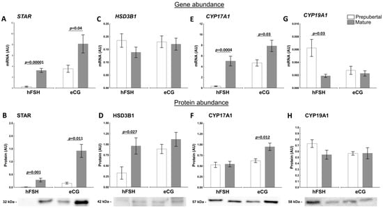 Sexual maturity status (pre-puberty or maturity) change abundance of factors related to production of androgens and estrogens in ovarian follicles of hFSH- and eCG-primed gilts. The expression of STAR (A,B), HSD3B1 (C,D), CYP17A1 (E,F) and CYP19A1 (G,H) in prepubertal and mature gilts was evaluated. Gene expression was normalized to the geometric mean of ACTB and GAPDH (AU), identified as the best reference genes by NormFinder algorithm. Protein levels were normalized to total protein content (AU) using TGX Stain-Free gel technology (B,D,F,H). Uncropped blots are presented in Supplementary Figure S1. Data were analyzed using Student’s t-test for each treatment and are presented as mean ± SEM (n = 6 per group). Line with a p-value denotes significant differences between prepubertal and mature gilts. AU—arbitrary units.