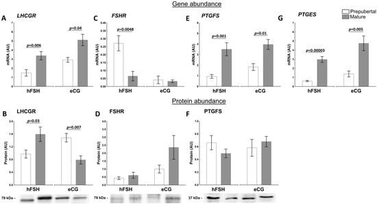 Sexual maturity status (pre-puberty or maturity) affect abundance of factors related tosteroid hormone synthesis and gamete production in ovarian follicles of hFSH- and eCG-primed gilts. The abundance of LHCGR (A,B), FSHR (C,D), PTGFS (E,F) and PTGES (G) in prepubertal and mature gilts was evaluated. Gene expression was normalized to the geometric mean of ACTB and GAPDH, identified as the best reference genes by NormFinder algorithm. Protein levels were normalized to total protein content using TGX Stain-Free gel technology (B,D,F). Uncropped blots are presented in Supplementary Figure S2. Data were analyzed using Student’s t-test for each treatment and are presented as mean ± SEM (n = 6 per group). Line with a p-value denotes significant differences between prepubertal and mature gilts. AU—arbitrary units.
