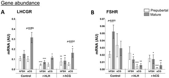An increased LHCGR mRNA abundance in control explants collected from eCG-primed mature vs. prepubertal gilts (p = 0.001) was indicated. A lower LHCGR mRNA abundance was observed in explants collected from prepubertal vs. mature eCG-primed gilts after in vitro delivery of the ovulatory stimuli—r-hCG (p = 0.012). In general, both in vitro treatments (r-hLH and r-hCG) decreased the mRNA abundance of LHCGR in follicular explants of prepubertal and mature hFSH- or eCG-primed gilts and reached the significance when compared to control (p < 0.05; Figure 6A).