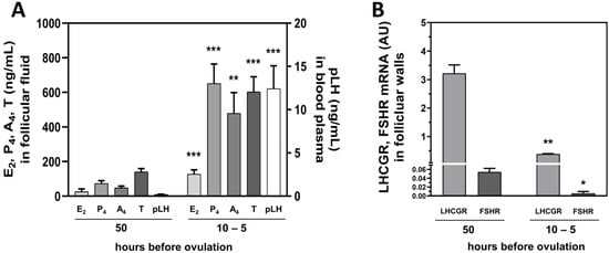 Hormonal milieu and dynamics of LHCGR and FSHR levels in follicular walls before ovulation. Concentrations of E2, P4, A4 and T in follicular fluid and pLH in blood plasma 50 and 10 to 5 h before ovulation (A). Expression of LHCGR and FSHR mRNA in preovulatory follicles walls 50 and 10 to 5 h before ovulation (B). * p < 0.05; ** p < 0.001; *** p < 0.0001 for hormones/receptors at 50 h vs. 10-5 h before ovulation (Student’s t-test). AU—arbitrary units.