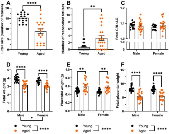 Pregnancy outcomes from young and aged dams at GD 20. (A) Litter size; (B) Reabsorptions; (C) Fetal crown-rump length (CRL):abdominal girth (AG) ratio; (D) Fetal weight; (E) Placental weight; (F) Fetal:placental weight ratio. Data presented as mean ± SEM; n represents litter average; n = 13–19 dams/group. Data are sex-specific means of litter outcomes, where applicable. Pregnancy outcomes were compared using a t-test (litter size), Mann Whitney U-test (reabsorptions), or a two-way ANOVA (dam age vs. fetal sex) followed by Sidak’s post hoc test. * p < 0.05; ** p < 0.01; **** p < 0.0001.