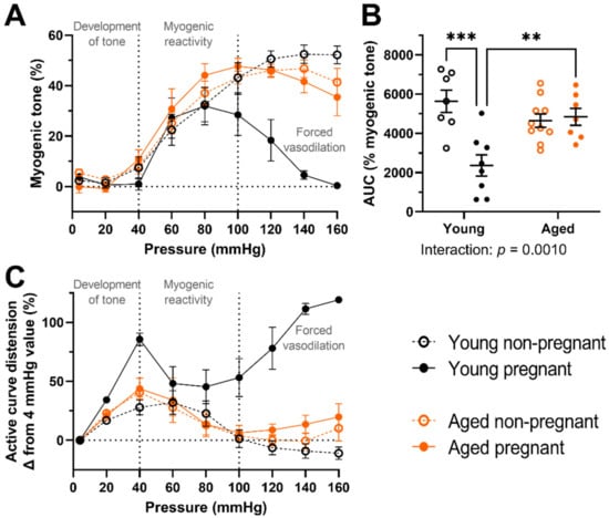 Active pressure myography outcomes for main uterine arteries from young (black) and aged (orange) nonpregnant (open circles) and pregnant (GD 20; closed circles) rats. (A) Percentage myogenic tone calculated from the intraluminal diameter (ID) measures using the equation: percentage myogenic tone = ((IDpassive − IDactive)/IDpassive) × 100, where IDactive is the intraluminal diameter when assessed in phosphate-buffered saline solution with calcium present to enable smooth muscle cell contraction, and IDpassive is the intraluminal diameter when assessed in a calcium-free solution containing papaverine to prevent smooth muscle contraction; (B) Percentage myogenic tone area under the curve (AUC), calculated from the entire pressure curve range of 4–160 mmHg; (C) The active pressure myography curve data, now presented as a percentage difference in ID from baseline (4 mmHg). Data presented as mean ± SEM; n = 7–10 rats/group. Percentage myogenic tone AUC was compared using a two-way ANOVA (age vs. pregnancy status) followed by Sidak’s post hoc test. ** p < 0.01; *** p < 0.001.