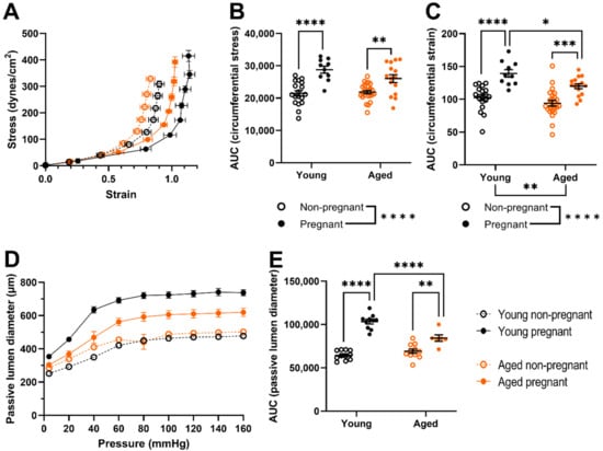 Main uterine artery circumferential stress and strain increased with pregnancy (p < 0.0001 overall). However, the circumferential strain of arteries from aged, pregnant dams remained lower than that of arteries from young pregnant dams (p = 0.0285, Figure 3A,C). There were no age-related differences in circumferential stress (Figure 3B). Passive lumen diameter increased with pregnancy in both young and aged rats (young: p < 0.0001, aged: p = 0.0011) but remained smaller in uterine arteries from aged, pregnant dams compared with young pregnant dams (p < 0.0001, Figure 3D,E). There was no age-related difference in arterial passive lumen diameter within the nonpregnant groups (Figure 3E).