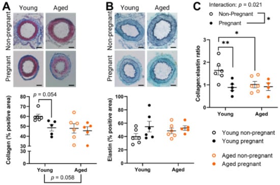 We next assessed arterial collagen and elastin as they affect vascular compliance and stiffness. The observed pregnancy-related decrease in the collagen:elastin ratio within the uterine arteries of young rats in the present study appears to be due to a decreased collagen content. In line with our findings, a decrease in collagen with pregnancy has been reported in uterine arteries of (young) pigs and sheep [,], which facilitates luminal widening and increased compliance as blood volume greatly increases. Elastin contributes to arterial compliance by enabling greater vascular stretch (if other vascular components allow). Studies with pig, sheep, and mouse models showed no changes in elastin area with pregnancy [,,,], and degradation of elastin with age in humans only starts to occur significantly in ages 60–70 []. In our study, the collagen:elastin ratio decreased with pregnancy in young rats but did not decrease with pregnancy in aged rats, which demonstrates less pregnancy-induced remodeling in aged rats. This may be because prior to pregnancy, the aged rats already had a ratio similar to that of young pregnant dams. The arrangement of collagen and elastin may have also been affected by advanced maternal age, as factors such as elastin fragmentation can also increase vascular stiffness [,]. Overall, the existing structural differences prior to pregnancy resulted in different age-related arterial remodeling in response to pregnancy.
