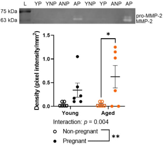 Densitometry analysis of activity by MMP-2 from main uterine arteries of young (black) and aged (orange) nonpregnant (open circles) and pregnant (GD 20; closed circles) rats. Representative zymography gel: the first lane has a protein ladder. Both pro-MMP-2 (72 kDa) and active MMP-2 (62 kDa) are visible. However, only MMP-2 bands had a sufficiently detectable band able to be used for analysis. Densitometry assessment: bands of clearing represent gelatinase activity by MMPs. L, ladder; YNP, young nonpregnant; YP, young pregnant; ANP, aged nonpregnant; AP, aged pregnant. Data presented as mean ± SEM; n = 6/group. Outcomes were compared using a two-way ANOVA (age vs. pregnancy status) followed by Sidak’s post hoc test. * p < 0.05; ** p < 0.01.