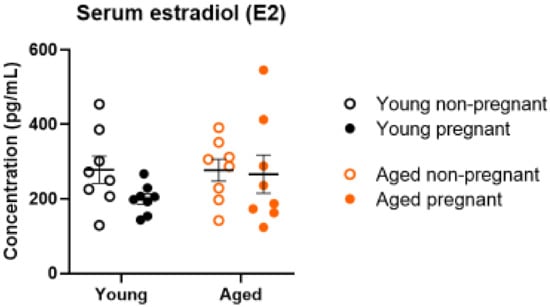 Serum estradiol (E2) concentrations of young (black) and aged (orange) nonpregnant (open circles) and pregnant (GD 20; closed circles) rats. Data presented as mean ± SEM; n = 8/group. Outcomes were compared using a two-way ANOVA (age vs. pregnancy status) followed by Sidak’s post hoc test.