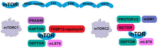 Architecture of mTORC1 and mTORC2. mTORC1 is mainly composed of mTOR, Raptor, mLST8, PRAS40, and DEPTOR. mTORC2 comprises mTOR, mLST8, Deptor, Rictor, mSIN1, and Protor1/2. mTOR is a complex protein composed of HEAT repeats and FAT, FRB, kinase, and FATC domains.