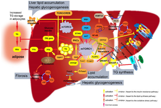 Therefore, data have shown that NAFLD is driven by metabolic syndrome and is closely related to lipid metabolism [via sterol regulatory element-binding proteins (SREBPs) [8], IR {via forkhead box O1 (Foxo1) and phosphatidate phosphatase 1 (Lipin-1)}, {OS via p53-induced gene 3 (PIG3), p53, c-Jun N-terminal kinase (JNK)}, the intestinal flora {via toll-like receptor (TLRs)}, autophagy, inflammation, genetic polymorphisms, and epigenetics [9,10]. To date, requirements from some phase 2 and phase 3 clinical trials for NAFLD have not been met and have barely met the currently required histological criteria [11]. These apparent failures partly reflect the current lack of precise disease and target definitions, as well as the incomplete understanding of the disease pathogenesis; therefore, there is an urgent need to identify key targets or pathways that affect the development and progression of NAFLD.