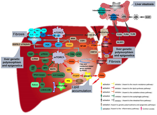 From the macro-mediators, which each influence various factors, the relationship between the intestinal flora, via enterohepatic shaft TLR family receptors, can influence the autophagy and inflammation of the liver, and further affect the liver in the mTOR regulation of lipid metabolism, insulin resistance, oxidative stress, and a series of other developmental processes during the circulation of the liver, causing liver inflammation, abnormal lipid metabolism, and other burdens. This will lead to a vicious circle of liver injuries and diseases, which then affect liver steatosis, fat accumulation, fibrosis, and other processes that lead to the occurrence and development of NAFLD. Genetic polymorphism and epigenetics are also closely related to OS and the regulation of the inflammatory response. Therefore, each influencing factor can affect NAFLD processes independently or through interactions with each other.