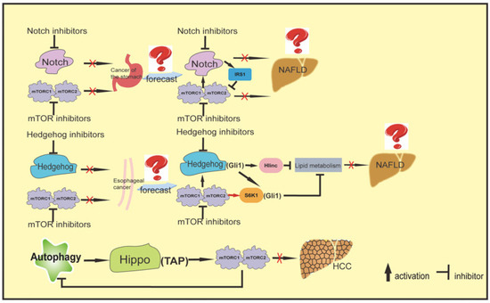 In conclusion, the Hippo, Hedgehog, Notch, and mTOR pathways are closely related to cancer. Although there are few studies on the occurrence and development of NAFLD-associated HCC, these pathways may provide new therapeutic options and research directions for the clinical treatment of this disease. In addition, research in esophageal cancer and gastric cancer, and findings regarding crosstalk between mTOR and both Notch and Hedgehog, have confirmed the related hypotheses. Crosstalk between Hippo, Hedgehog, Notch, and mTOR is closely related to the occurrence and development of liver cancer. Moreover, dual inhibitor combination therapy for liver cancer and other types of cancer is eagerly anticipated. However, as there have been few studies on the relationships of mTOR with Hippo, Hedgehog, and Notch, the summary presented herein is not comprehensive. As research progresses, future reviews will provide updates. How these pathways interact to dysregulate cell proliferation to support tumorigenesis, and the potential therapeutic targeting of these pathways in combination, remain important areas of future research (Figure 4).