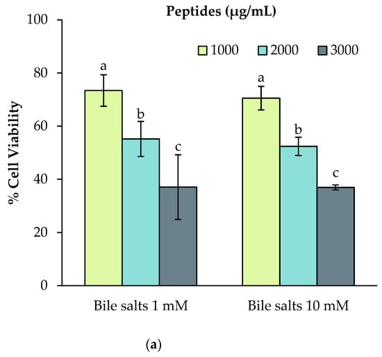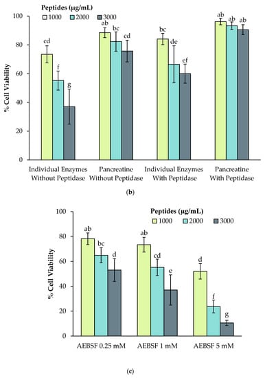 The impact of various concentrations (3000, 3500 and 4000 μg peptides/mL) of 3 kDa permeate of faba bean digestate (variety Fabelle) obtained in different digestion conditions on Caco-2 cell viability. The digestions were performed with different (a) bile salts concentrations; (b) different intestinal enzyme combinations; (c) different protease inhibitor (4-(2-Aminoethyl) benzenesulfonyl fluoride hydrochloride (AEBSF)) concentrations. Data are expressed as mean ± standard deviation of three experiments and means without a common letter differ (p < 0.05) as analyzed by two-way ANOVA and the Tukey’s test.
