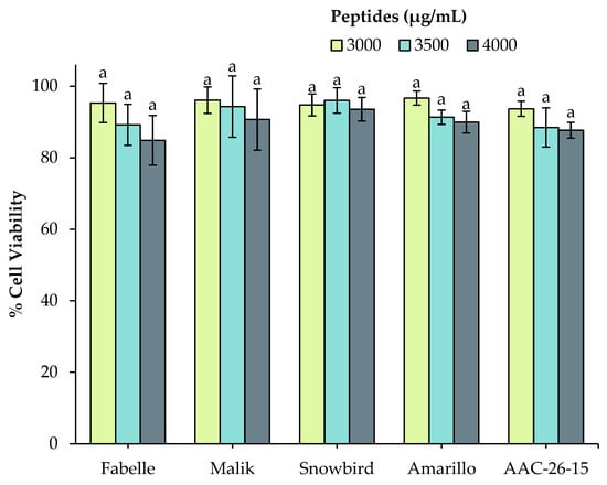 Impact of different concentrations (3000, 3500 and 4000 μg peptides/mL) of 3 kDa permeate of legume digestates obtained in the optimized digestion conditions (AEBSF 1 mM, bile salt 10 mM, pancreatin and peptidase) on cell viability. Data are expressed as mean ± standard deviation and means without a common letter differ (p < 0.05) as analyzed by two-way ANOVA and the Tukey’s test.