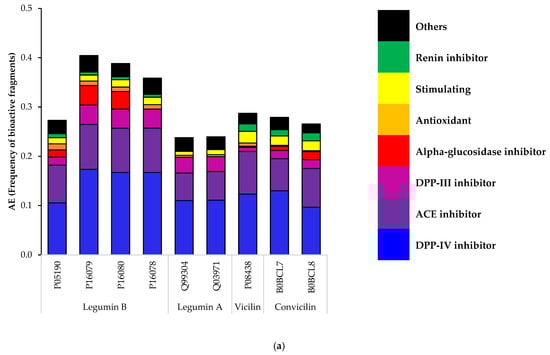 The potential bioactive fragments released during the gastrointestinal digestion of the major faba bean, pea and soy storage proteins were investigated using an in silico analysis. The accession numbers of the protein used for the analysis are displayed in Table 6. The globulins’ sequences were hydrolyzed in silico with pepsin (pH > 2) (EC 3.4.23.1), trypsin (EC 3.4.21.4) and α-chymotrypsin (EC 3.4.21.1) simultaneously to simulate gastrointestinal digestion with the Bioactive Peptide Database of University of Warmia and Mazury (BIOPEP-UWM) enzyme tools []. The frequency of the peptide fragments’ release with the selected enzyme activity values (AE) for each of the selected protein and bioactivities were automatically calculated by the BIOPEP-UWM algorithm [] and retrieved on 14 July 2022.