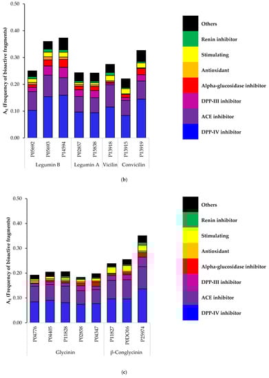 An in silico analysis was used as a first screening tool to investigate the potential bioactive fragments released during the gastrointestinal digestion of the faba bean, pea and soy main storage proteins. As shown in Figure 3, the bioactive fragments’ frequency (AE) pattern was quite similar for the three legumes, which can be explained by protein sequence similarities. For faba beans and peas, Legumin B had the highest frequency of bioactive fragments, and for soy it was β-Conglycinin. The Dipeptidyl Peptidase-IV (DPP-IV) and the Angiotensin-Converting Enzyme (ACE) inhibitor were the most frequent fragments released by the selected enzymes for the three legumes. The antioxidant fragments were also present, but in a smaller proportion. It is important to note that certain peptide bioactive properties were more studied in the literature than others [], therefore more peptide sequences with those given activities have been ascertained. When the analysis was conducted, there were 1084 ACE inhibitor, 772 antioxidant and 432 DPP-IV inhibitory fragments out of 4485 peptides listed in the Bioactive Peptide Database of University of Warmia and Mazury (BIOPEP-UWM database). The fact that less DPP-IV inhibitory fragments are listed, while they are the most frequent fragments found in the three legumes’ globulins, suggest that this is a promising bioactivity to study further. Interestingly, the frequency of the antioxidant fragments is similar to that of the more rarely studied bioactivities, such as stimulating (87), Dipeptidyl Peptidase-III (DPP-III) inhibitor (66), alpha glucosidase inhibitor (34) and renin inhibitor (41). Nonetheless, one needs to consider that the AE parameter is an indication of the bioactive fragment frequency and not the bioactivity intensity. Experimental work is therefore needed to complement those results and target the most promising bioactivities. Besides, the in silico hydrolysis pattern is only based on the protein primary structure, and thus the bioactive fragments obtained experimentally are likely to differ to some extent.