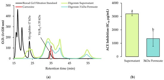 (a) Molecular weight distribution of peptides; and (b) exhibited antihypertensive activity of the faba bean digestate (variety Fabelle) before and after 3 kDa cut-off ultrafiltration. The ACE inhibition data are expressed as mean ± standard deviation and means without a common letter differ (p < 0.05) as analyzed by one-way ANOVA and the Tukey’s test.