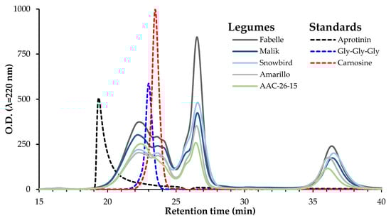 The size exclusion HPLC profiles of the five legumes’ 3 kDa permeates are shown in Figure 5. There were no noticeable differences among the faba beans, pea and soy profiles. All of the patterns were composed of three main peaks with retention times of ~22.5, 26.5 and 36.5 min. The first peak had a retention time overlapping the carnosine (~226 Da) and Gly-Gly-Gly (~189 Da). This peak is likely to correspond with the small peptides with molecular weights in the same range as these standards. The two other peaks had higher retention times than the dipeptide carnosine standard, therefore probably corresponding to the amino acid residues.