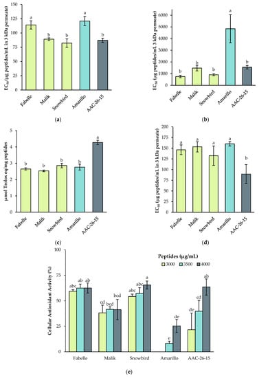 Antioxidant activity of the 3 kDa permeate of legume digestates as assessed by (a) the 2,2′-azinobis(3-ethylbenzothiazoline-6-sulfonic acid) (ABTS) assay; (b) the 2,2-diphenyl-1-picrylhydrazyl (DPPH) assay; (c) the oxygen radical absorbance capacity (ORAC); (d) the iron chelating assay; and (e) the cellular antioxidant assay (CAA). Data are expressed as mean ± standard deviation and means without a common letter differ (p < 0.05) as analyzed by one-way ANOVA and the Tukey’s test.