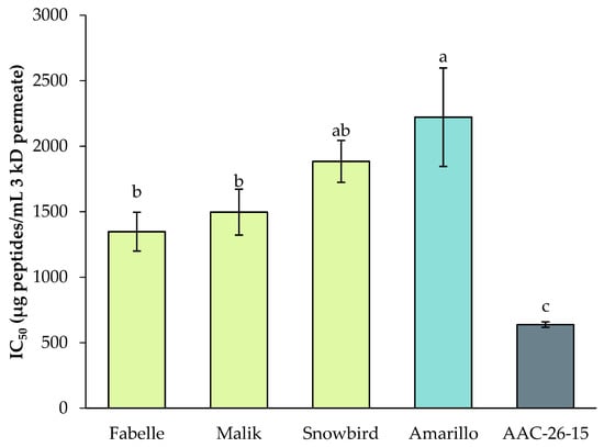 The antihypertensive activity of the legume 3 kDa permeates was evaluated by means of the Angiotensin-Converting Enzyme (ACE) inhibition assay (Figure 7). There were no significant differences for the ACE inhibition activity among the faba bean varieties. The soy had a significantly lower IC50 compared to the faba beans and peas, which means a higher antihypertensive activity. The Fabelle and Malik varieties had a significantly higher antihypertensive activity compared to the pea, but the Snowbird variety was similar to the pea. The obtained IC50 for the faba beans were in the same range as the values obtained by Jakubczyk et al. [] for a 3 kDa permeate of an in vitro gastrointestinal digestate of fermented faba bean seeds. In their study, the IC50 varied from 1010 to 2920 ug/mL, depending on the fermentation condition used, whereas in this study the values varied from 1348 to 1884 µg/mL. Dugardin et al. [] obtained a lower IC50 value for an in vitro gastrointestinal digestate of faba bean protein isolate (IC50 = 52 ug/mL), which can be explained by experimental conditions disparities, such as the lower ACE unit used in their study (0.05 U/mL) compared to ours (0.8 U/mL). Moreover, the faba bean protein isolate could possibly have a higher digestibility rate than the faba bean flour, leading to a higher content of the smaller and highly bioactive peptides.