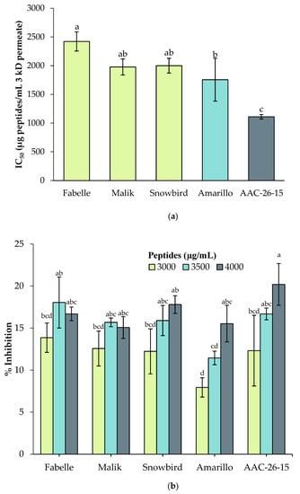 Antihypertensive activity (Angiotensin-Converting Enzyme inhibition) of the 3 kDa permeate of legume digestates. Data are expressed as mean ± standard deviation and means without a common letter differ (p < 0.05) as analyzed by one-way ANOVA and the Tukey’s test.