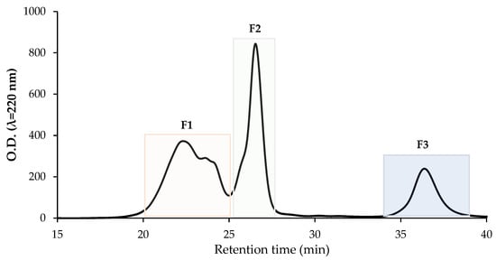 Peptide fractionation of the 3 kDa permeate of Fabelle in vitro gastrointestinal digestate by size exclusion HPLC. F1, fraction 1; F2, fraction 2; F3, fraction 3.
