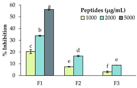 Angiotensin-Converting Enzyme inhibition of faba bean (variety Fabelle) peptide-enriched fractions (F1, F2 and F3). Data are expressed as mean ± standard deviation and means without a common letter differ (p < 0.05) as analyzed by one-way ANOVA and the Tukey’s test.