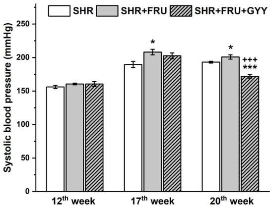 The values of the systolic blood pressure in control SHR (SHR, n = 8), SHRs treated with 10% fructose solution (SHR+FRU, n = 8), and SHRs treated with 10% fructose solution and 266 µg/kg/day GYY-4137 (SHR+FRU+GYY, n = 8). Data are shown as mean SBP ± S.E.M. Statistical analysis was performed by one-way ANOVA with a Bonferroni post-hoc test. * p < 0.05 vs. SHR, *** p < 0.001 vs. SHR, +++ p < 0.001 vs. SHR+FRU.