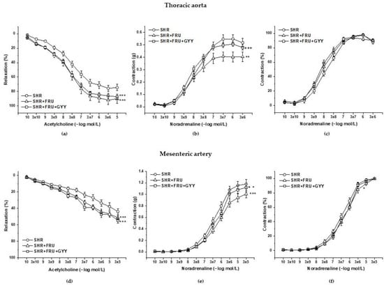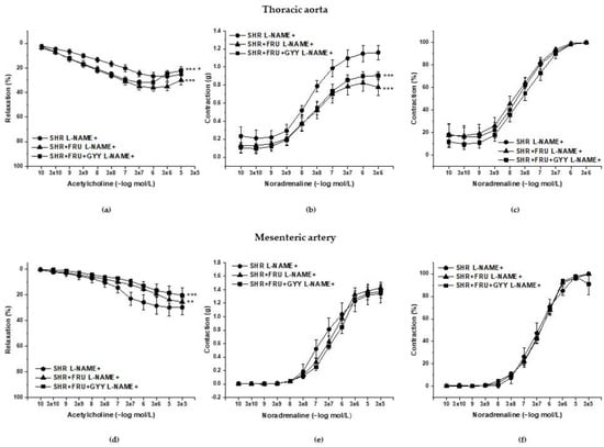 Endothelium-dependent vasorelaxant response of the thoracic aorta (a) and mesenteric artery (d). Noradrenaline-induced a contractile response of the thoracic aorta (b) absolute response, (c) percent values of the maximum response), mesenteric artery (e) absolute response, (f) percent values of the maximum response). Arteries were isolated from spontaneously hypertensive rats (SHRs), SHRs treated with fructose (SHR+FRU), and SHRs treated with fructose and GYY-4137 (SHR+FRU+GYY). The results are presented as the mean ± S.E.M. Statistical analysis was performed by two-way ANOVA with a Bonferroni post-hoc test. * p < 0.05, ** p < 0.01, and *** p < 0.001 vs. SHR, + p < 0.05 and +++ p < 0.001 vs. SHR+FRU.