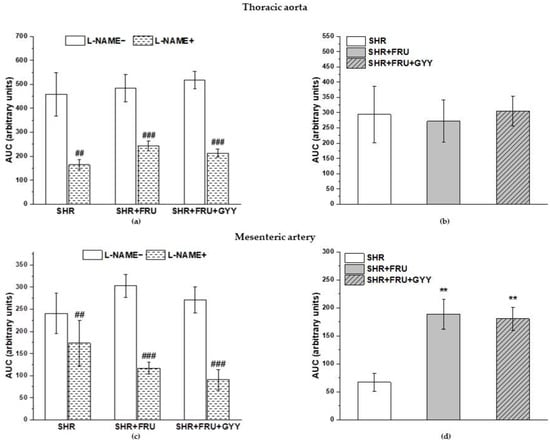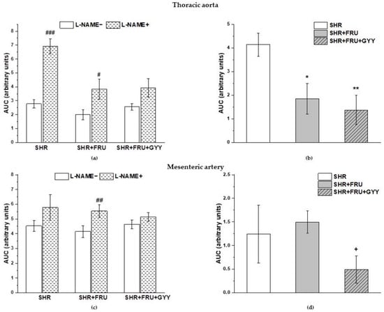 The participation of the NO/NOS system in the contractile responses of thoracic aorta (a,b) and mesenteric artery (c,d). The AUC calculated before and after the pre-treatment with L-NAME in individual groups (a,c). The difference between the AUC before and after L-NAME—comparison among groups (b,d). Arteries were isolated from spontaneously hypertensive rats (SHRs), SHRs treated with fructose (SHR+FRU), and SHRs treated with fructose and GYY-4137 (SHR+FRU+GYY). AUC—area under the curve; L-NAME—NG-nitro-L-arginine methylester. The data are presented as the mean ± S.E.M. Statistical analysis was performed by paired t-test or one-way ANOVA. # p < 0.05, ## p < 0.01, and ### p < 0.001 vs. control L-NAME-, * p < 0.05 and ** p < 0.01 vs. SHR, + p < 0.05 vs. SHR+FRU.