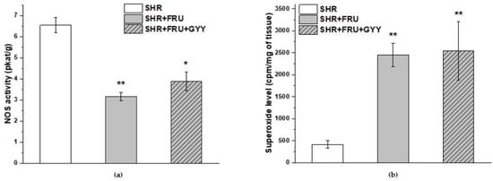 Total NOS activity in the TA after treatment with both fructose and its combination with GYY-4137 was significantly decreased compared to the SHR group (p < 0.01, p < 0.05, respectively) (Figure 6a). On the other hand, compared to the SHR group, there was a significant increase in the level of superoxide in both fructose and GYY-4137 groups (p < 0.01) (Figure 6b).