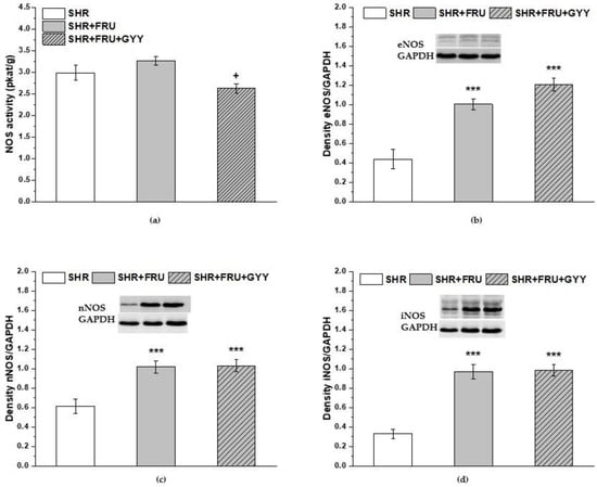 The total NOS activity (a), the protein levels of endothelial NOS (b), neuronal NOS (c), and inducible NOS (d) in the left ventricle. Spontaneously hypertensive rats (SHRs), SHRs treated with fructose (SHR+FRU), and SHRs treated with fructose and GYY-4137 (SHR+FRU+GYY). Endothelial NOS—eNOS; neuronal NOS—nNOS; inducible NOS—iNOS. Data are expressed as the mean ± S.E.M. Statistical analysis was performed by one-way ANOVA. *** p < 0.001 vs. SHR, + p < 0.05 vs. SHR+FRU.