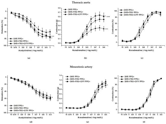 The vasoactive responses of the thoracic aorta (a–c) and mesenteric artery (d–f) after incubation with DL-propargylgycine (PPG). Endothelium-dependent vasorelaxant response of the thoracic aorta (a) and mesenteric artery (d). Noradrenaline-induced contractile response of the thoracic aorta (b) absolute response, (c) percent values of the maximum response), mesenteric artery (e) absolute response, (f) percent values of the maximum response). Arteries were isolated from spontaneously hypertensive rats (SHR), SHRs treated with fructose (SHR+FRU) and SHRs treated with fructose and GYY-4137 (SHR+FRU+GYY). The results are presented as the mean ± S.E.M. Statistical analysis was performed by two-way ANOVA with a Bonferroni post-hoc test. * p < 0.05 and *** p < 0.001 vs. SHR, + p <0.05 and +++ p < 0.001 vs. SHR+FRU.